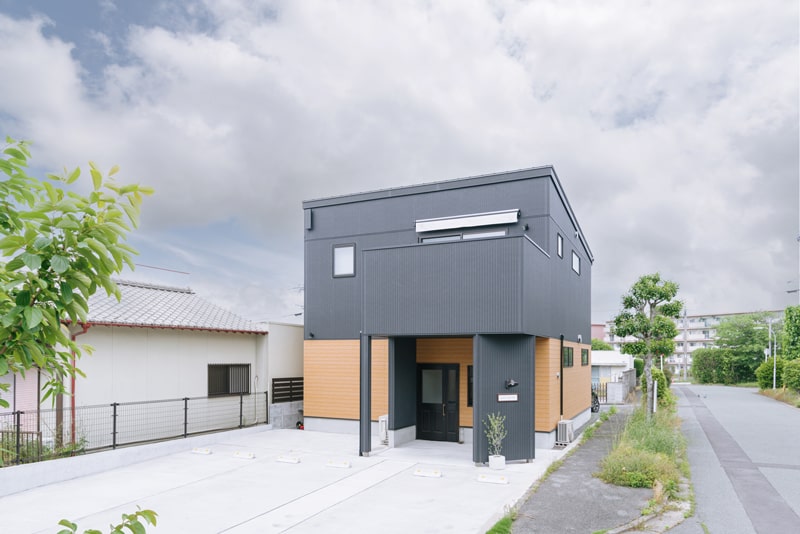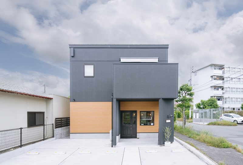 2階がお住まいになっておりますが正面に敢えてバルコニーを持ってくることで、お客様が雨の日でも濡れない庇代わりに。バルコニーの壁を一般的な高さよりも高くしてお住まいのプライバシーも確保しつつ、リビングの採光も十分とれるようにしました。バルコニーを支える柱と壁を斜めに取付けサインを目立たせています。