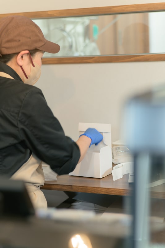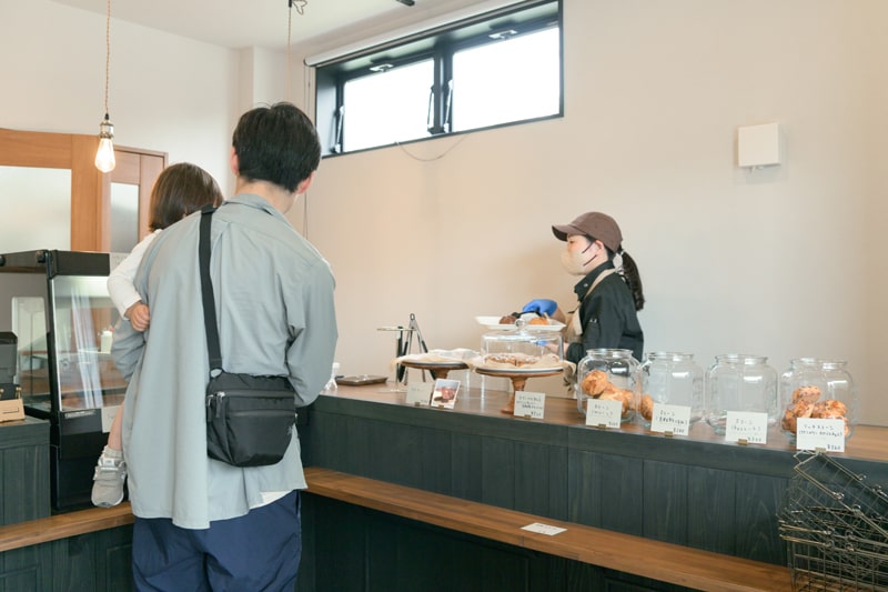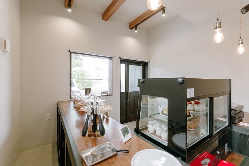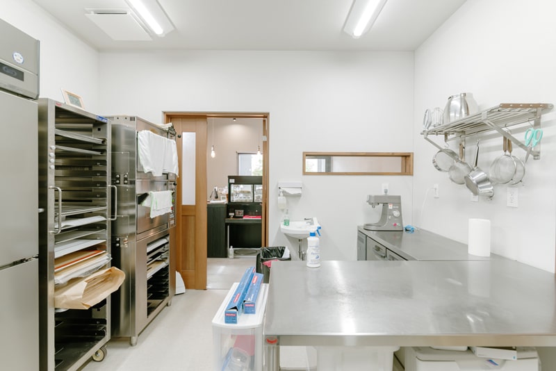 売り場の奥には製造スペースがあり、製造中でも店内の様子を伺うことができる小窓を設置。床の素材には公共施設によく用いられる耐久性、耐水性に優れた「長尺シート」の中でも細菌の増殖を抑制する効果があるものを採用されました。