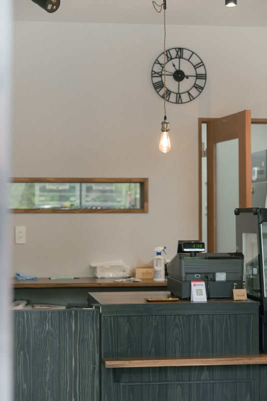 お客様が見やすい高さに加え、オーナーさまがお客様との距離が遠くならないよう幅も考慮し、冷蔵ショーケースも並べた上で統一感がでるよう全て造作、納得のいくまで何度も色味の調整をさせていただきました。カウンターの裏は収納になっているため店内をすっきりと保つことができます。