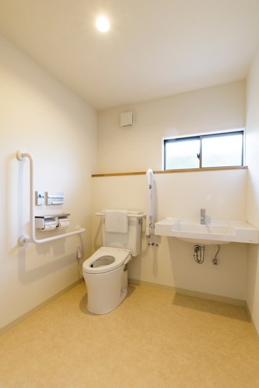 床はフルフラットで入口にはスロープを設置。トイレも手すりをつけ十分な広さを確保し、足腰の弱い方や車イスの方にも優しいユニバーサルデザインに。