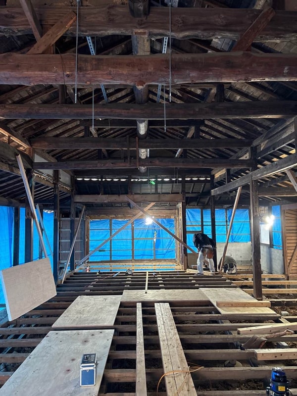 【施工中】躯体だけを残し床壁天井を全て補強改修する様子です。
