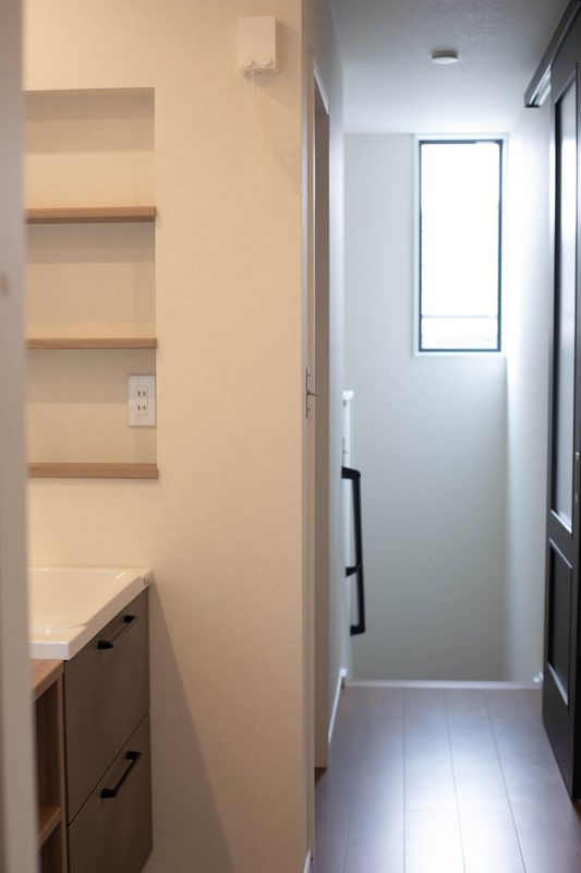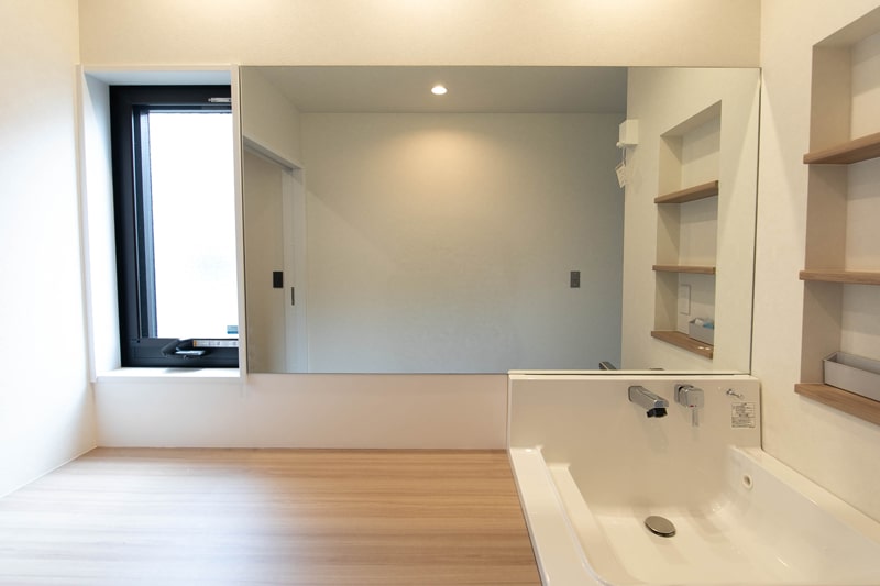 洗濯ものを畳んだり、髪を乾かしたり、横並びでも使える洗面室。