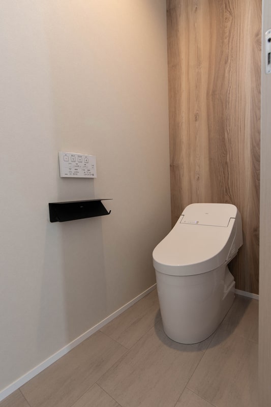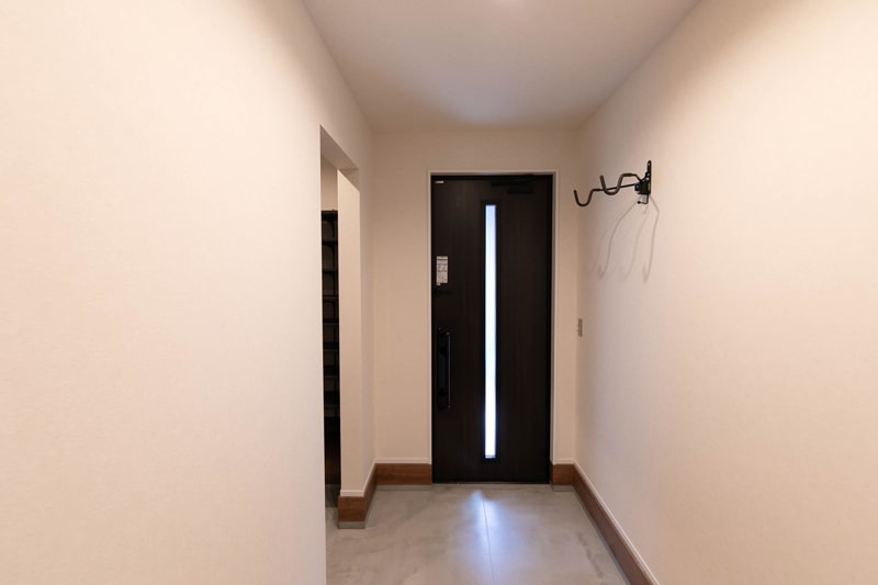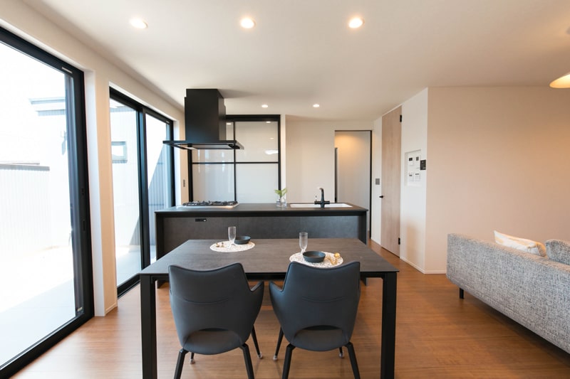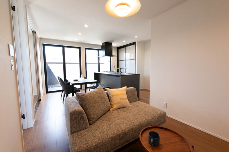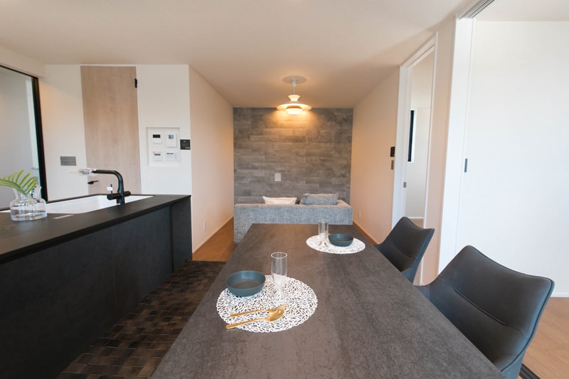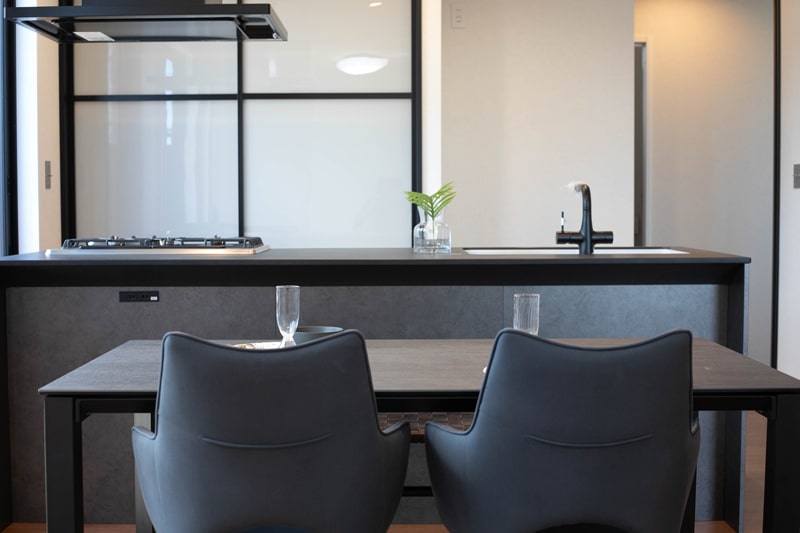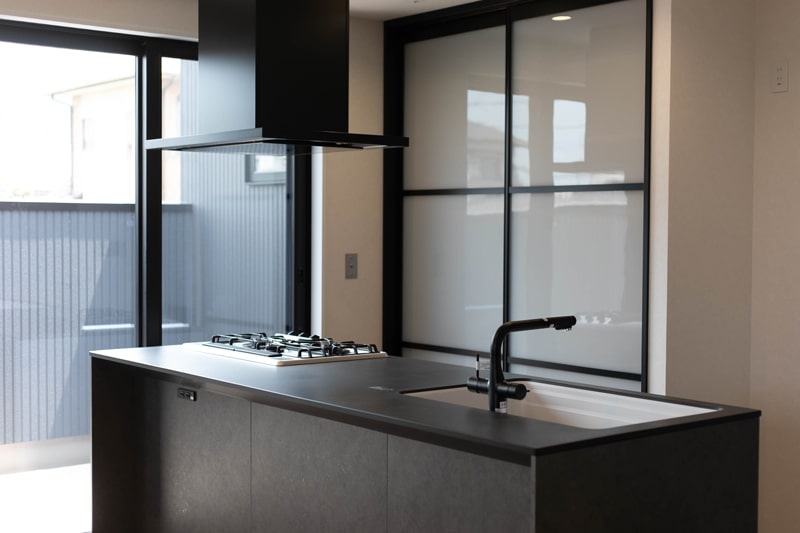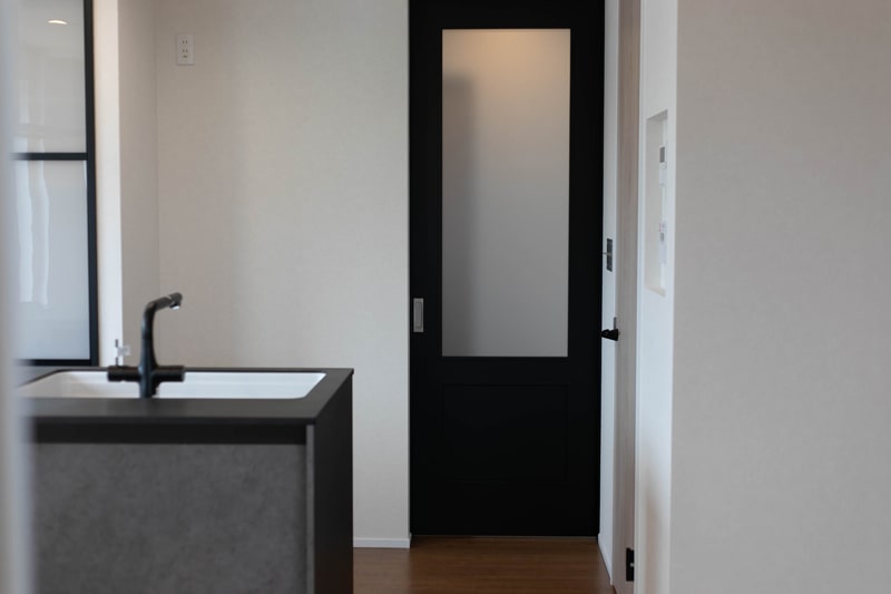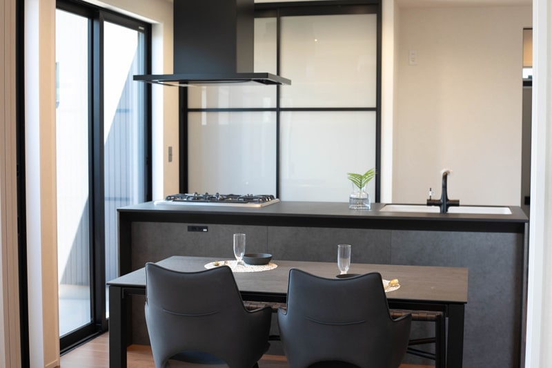特にこだわられたキッチンは、黒で統一されスタイリッシュでカッコよく気分が上がる空間。すぐ後ろには大きな炊飯器やカップボード・ストックも全て収まる広いパントリーを設け、中が見えない乳白色のパネル扉をつけてキッチン周りをすっきり収めました。バルコニーは通常よりも壁の高さを高くしてプライバシーを確保しつつ、大開口の窓を設けることで光が差し込む明るいLDKを実現しました。